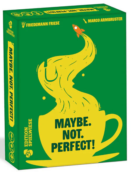 Was haben eine Barista, eine Astronautin und ein Fischer miteinander zu tun? Maybe not perfect, das Spiel von Erfolgsautor Friedemann Friese, lädt die Spielenden ein sich darüber den Kopf zu zerbrechen. Eine Person denkt sich einen Hinweis aus, der zu einem der Berufe ein bisschen (maybe), zu einem gar nicht (not) und zu einem richtig gut (perfect) passt. Zum Beispiel Wasser: Die Anglerin ist regelrecht umgeben davon. Der Barista arbeitet auch mit Wasser, aber eben nicht nur. Und da, wo die Astronautin sich befindet, ist vermutlich am wenigsten Wasser vorhanden. Gemeinsam versuchen die Spielenden möglichst viele Hinweise richtig zuzuordnen.