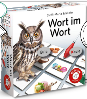 Welche Memo-Plättchen gehören wohl in Wort im Wort zusammen? EULE findet sich in KEULE wieder, die Farbe ROT in BROT. Gespielt wird nach dem bekannten Memoprinzip: Findet man ein zusammenpassendes Paar, darf man es behalten und ist gleich noch einmal an der Reihe. Wer am Ende des Spieles die meisten Paare gesammelt hat, gewinnt.
