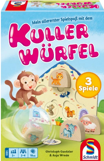Mein allererster Spielspaß mit dem Kullerwürfel ist eine Spielsammlung für die Allerkleinsten, die mit den drei Spielmöglichkeiten mitwächst und einen kinderleichten Einstieg in die Brettspielwelt gewährt. Sobald der Kullerwürfel im Raum liegt, beginnt spielerisches Entdecken. Die neue Spielesammlung von Schmidt Spiele richtet sich an die Allerkleinsten und bietet in drei abwechslungsreichen Varianten jede Menge Möglichkeiten zum Ausprobieren, Spielen und ersten Lernen. Im Zentrum des Spielerlebens stehen der Kullerwürfel sowie drei Häuser und niedliche Holztiere.