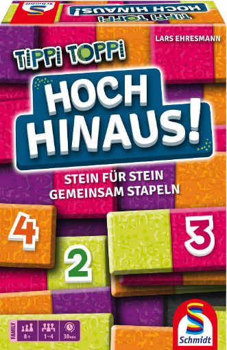 „Es darf kein Lila am Rand liegen“, „Genau fünf Orange“ oder doch lieber „Drei Pinke in einer Diagonale“? In Tippi Toppi: Hoch Hinaus! stellen sich bis zu vier Spielende ab acht Jahren gemeinsam einer Vielzahl kniffliger Aufgaben. Dazu legen sie - gut überlegt - Plättchen aus ihrer eigenen Hand in ein Raster aus 4x3 Feldern. Der besondere Clou: Die Plättchen werden übereinander gelegt. So entstehen mehrere Ebenen, die für das Erfüllen mancher Aufgaben entscheidend sind und immer neue Möglichkeiten, aber auch Einschränkungen bedeuten.