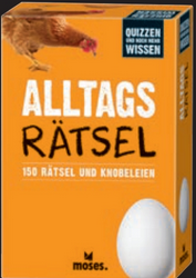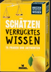 In der Quiz-Reihe Quizzen und noch mehr Wissen gibt es in den Titeln Schätzen Verrücktes Wissen, Allgemeinwissen Gesundheit & Ernährung, Allgemeinwissen von A bis Z, Alltagsrätsel, Gehirnjogging und Schätzen rund um die Welt jeweils Spannende Fragen und verblüffende Antworten auf 75 Karten für alle, die ihr Wissen prüfen und noch mehr wissen wollen.
