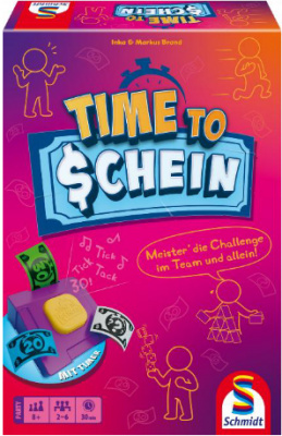 Einen hüfthohen Turm aus Alltagsgegenständen bauen, acht Herzen ineinander zeichnen oder ein Selfie mit drei Händen, einem Fuß und dem Schachteldeckel knipsen bei Time to Schein gibt es eine Vielzahl an kreativen Challenges. Mal performt man allein, mal zusammen, manchmal konzentriert und manchmal sportlich, aber immer unter Zeitdruck. Denn das Team handelt vorher aus, wie viel Zeit für die jeweilige Aufgabe investiert werden soll. Mit Geldscheinen, deren Wert der Anzahl an Sekunden entspricht, wird der sprechende Timer gefüttert. Und dieser zählt gnadenlos mit. Wenn es einmal knapp wird, hat das Team einen kleinen Joker: Es kann noch genau einen Geldschein nachlegen und damit für die Challenge wertvolle Sekunden gewinnen. Nur wenn alle ihre eigenen Fähigkeiten gut einschätzen und das gemeinsame Budget klug einsetzen, schafft es das Team, die verlangten fünf Herausforderungen erfolgreich zu meistern, bevor das Geld ausgeht.
