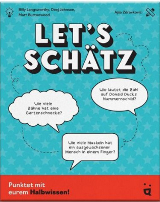Let‘s Schätz ist ein Kommunikationsspiel, bei dem Reden und Raten im Mittelpunkt stehen. Die Spielenden bekommen skurrile Fragen, deren Antwort immer eine Zahl ist. Ihre Aufgabe: Sie bringen die Antworten in die richtige Reihenfolge - von klein nach groß. Schaffen sie es, als Team die perfekte Punktzahl zu erreichen, oder bleiben sie am Ende ratlos zurück?