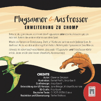 Die Erweiterung „Flugsaurier & Aasfresser“ bringt acht neue Karten mit geheimen Zielen für jede Person! Vielleicht müssen alle Dinos am Leben bleiben, vielleicht müssen sie alle ausgerottet werden oder vielleicht etwas anderes! Das ist eine tolle Abwechslung, die das Spiel auch bei wiederholtem Spielen spannend hält.