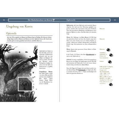 - Zeitleisten, um den Aufenthalt in Kosvin mit immer neuen Ereignissen zu gestalten, aber auch die Hinweise sich verdichten zu lassen. Hinweis-, Schatz-, NSC-Übersichten und ein Beziehungsgeflecht, um der Spielleitung einen guten Überblick zu geben