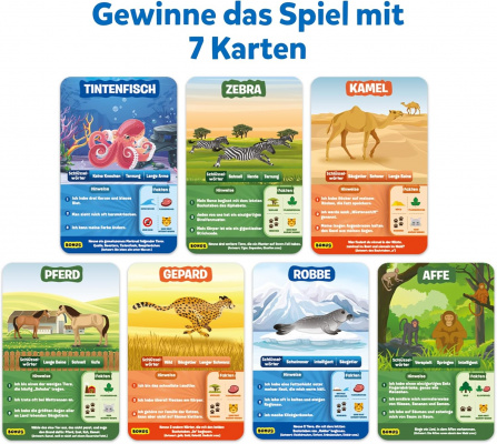 - EIN SPANNENDES KARTENSPIEL MIT FRAGEN: Ziehe ein Hilfsplättchen, stelle bis zu 10 Fragen um das Tier auf der Karte zu erraten! Ist das Tier Fleischfresser? Ist es ein Haustier? Wohnt das Tier in Gruppen? Wer richtig erraten kann, sammelt 7 Karten und gewinnt das Spiel!